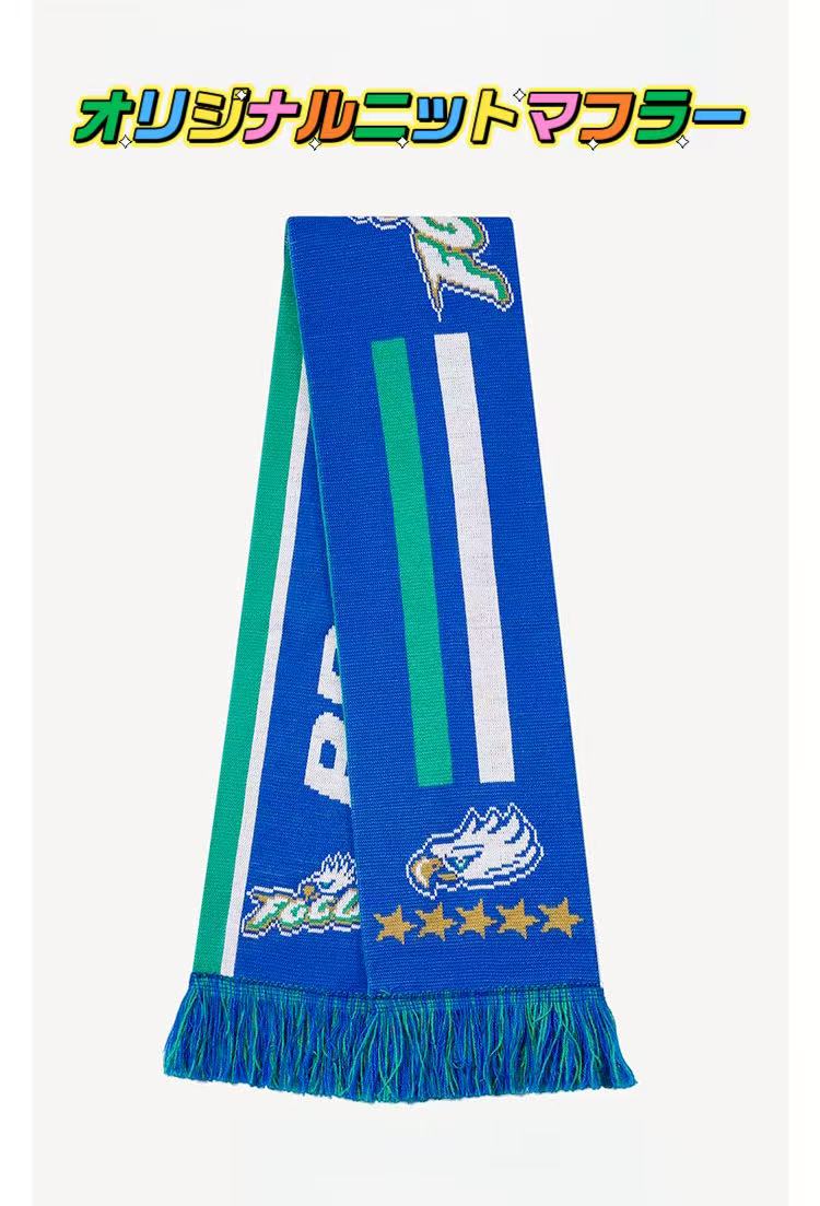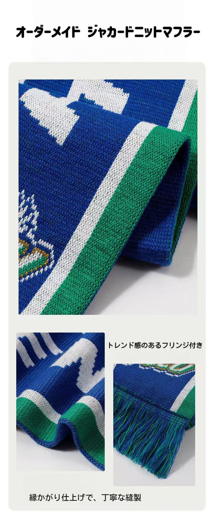 こちらの**オリジナルニットマフラー(ジャカード編み)**は、スポーツチーム・クラブの応援グッズ、イベント物販、企業ノベルティや記念品として幅広くご活用いただける定番アイテムです。