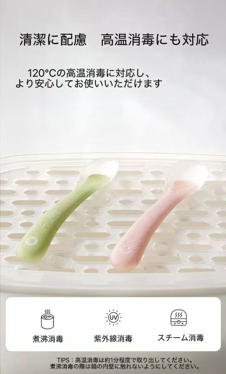 食品グレードのシリコン素材を使用し、安全性・耐久性・衛生面に配慮。毎日の離乳食タイムを快適にサポートします。