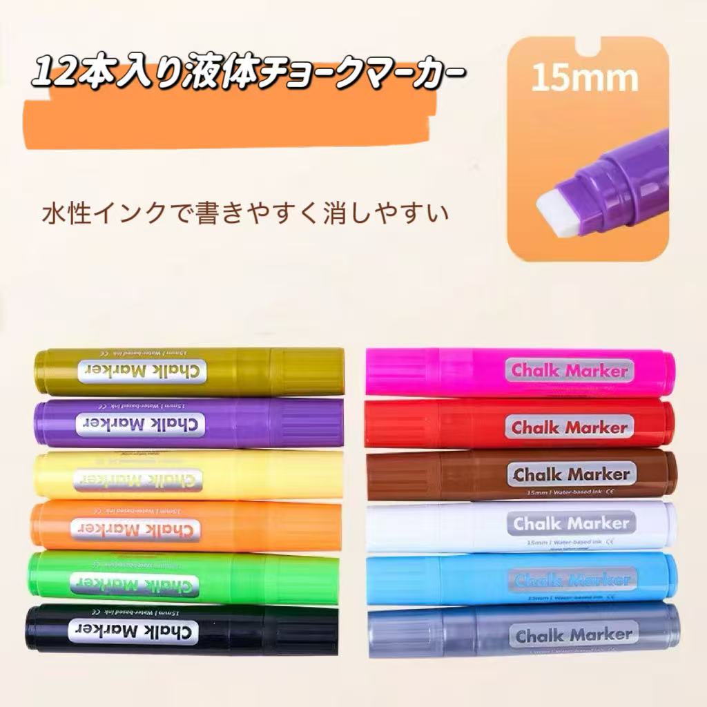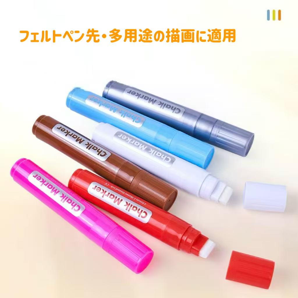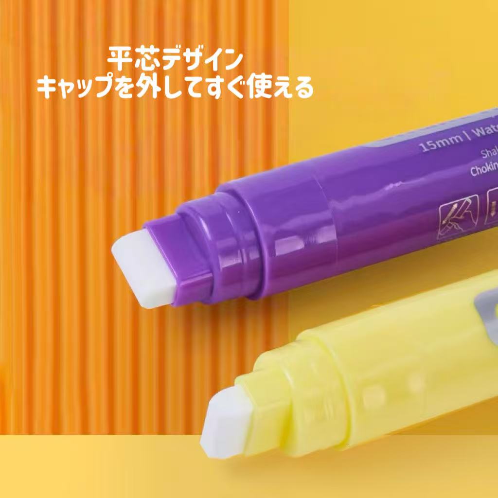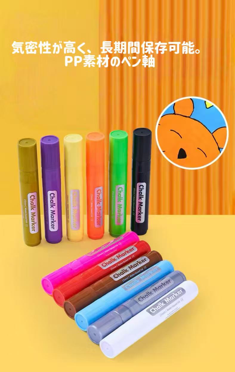 こちらの「水性チョークマーカー」は、ブラックボードやガラス、ホワイトボードなどに使用できる水性インクタイプのマーカーです。