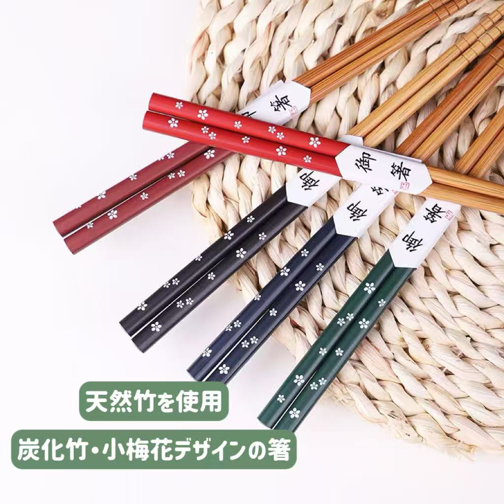 こちらの「炭化竹 小梅柄箸」は、天然竹を使用した環境にやさしいお箸です。